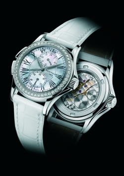 Cette nouvelle montre de voyage pour dame est un joyau qui allie trois grandes traditions de la manufacture genevoise: la forme classique de la ligne Calatrava, la complexité d’un mouvement affichant simultanément deux fuseaux horaires et l’art du joaillier illuminant le tout de diamants du plus bel éclat. Patek Philippe enrichit ainsi sa collection de montres compliquées pour femmes. La sophistication ne se limite pas au mouvement mécanique; elle concerne aussi le cadran de nacre dont la confection exige un très grand savoir-faire artisanal.